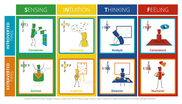 쉽게 답할 수 있는 여러 질문을 통해 개인별 주어신 상황이나 판단의 척도, 선호 경향 등을 종합하여 나타내는 성격유형 검사입니다. 상반되는 4가지 척도를 조합하여 총 16가지 성격 유형으로 나뉩니다.